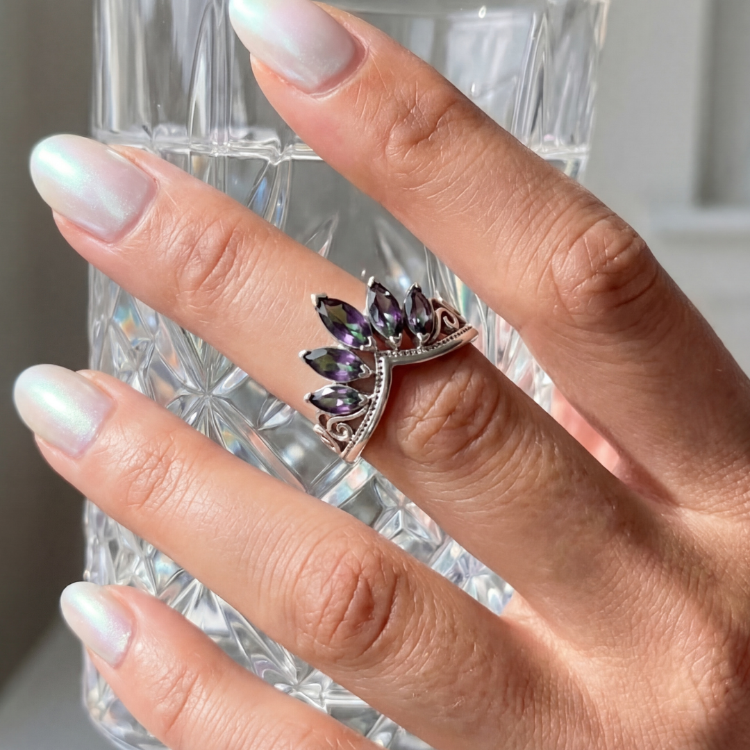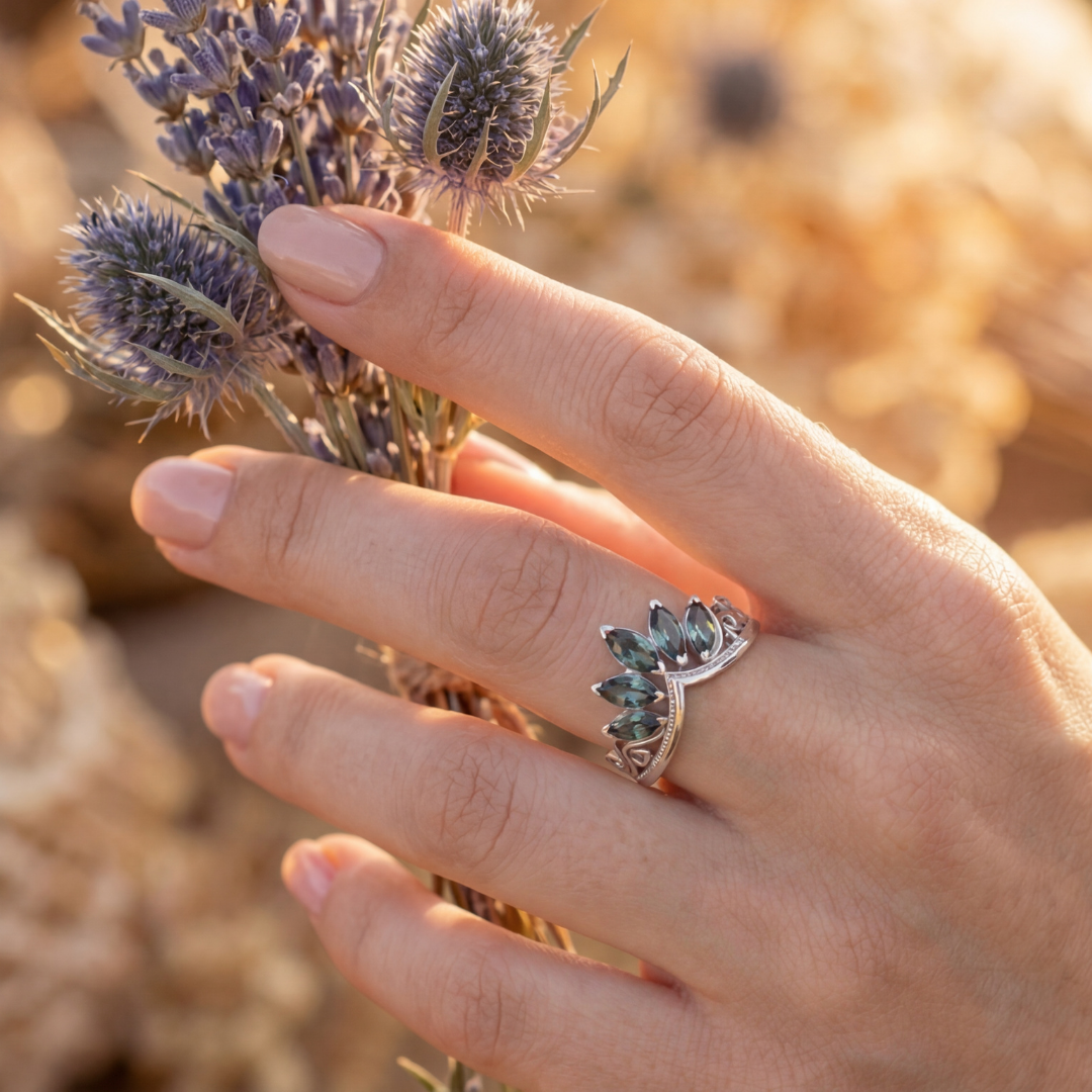 - Peri Masalı Estetiği: Mistik dünyalardan ilham alan bu tasarım, parmağınızda zarif bir taç formuyla ışıldayarak sizi bir peri masalının başrolüne taşır.
