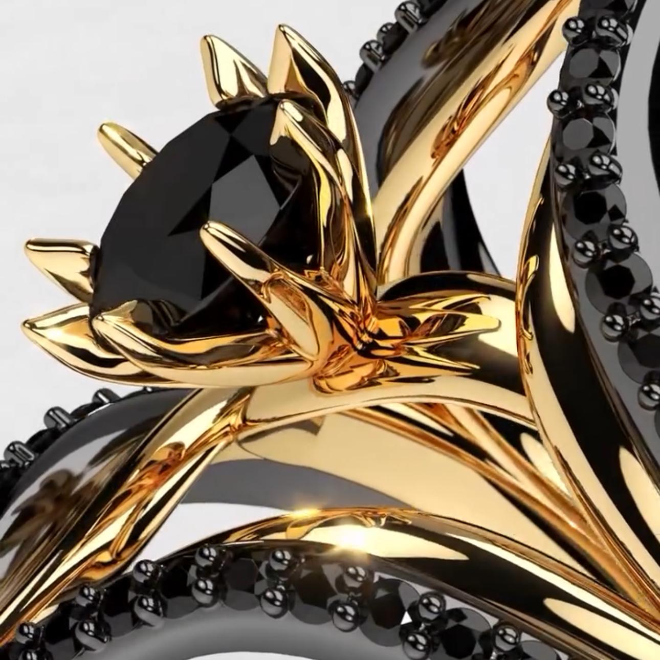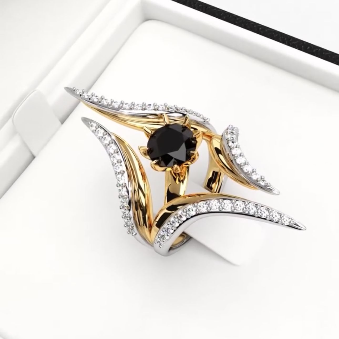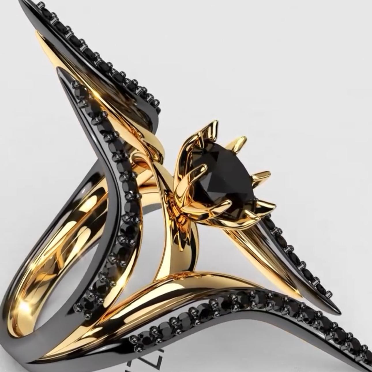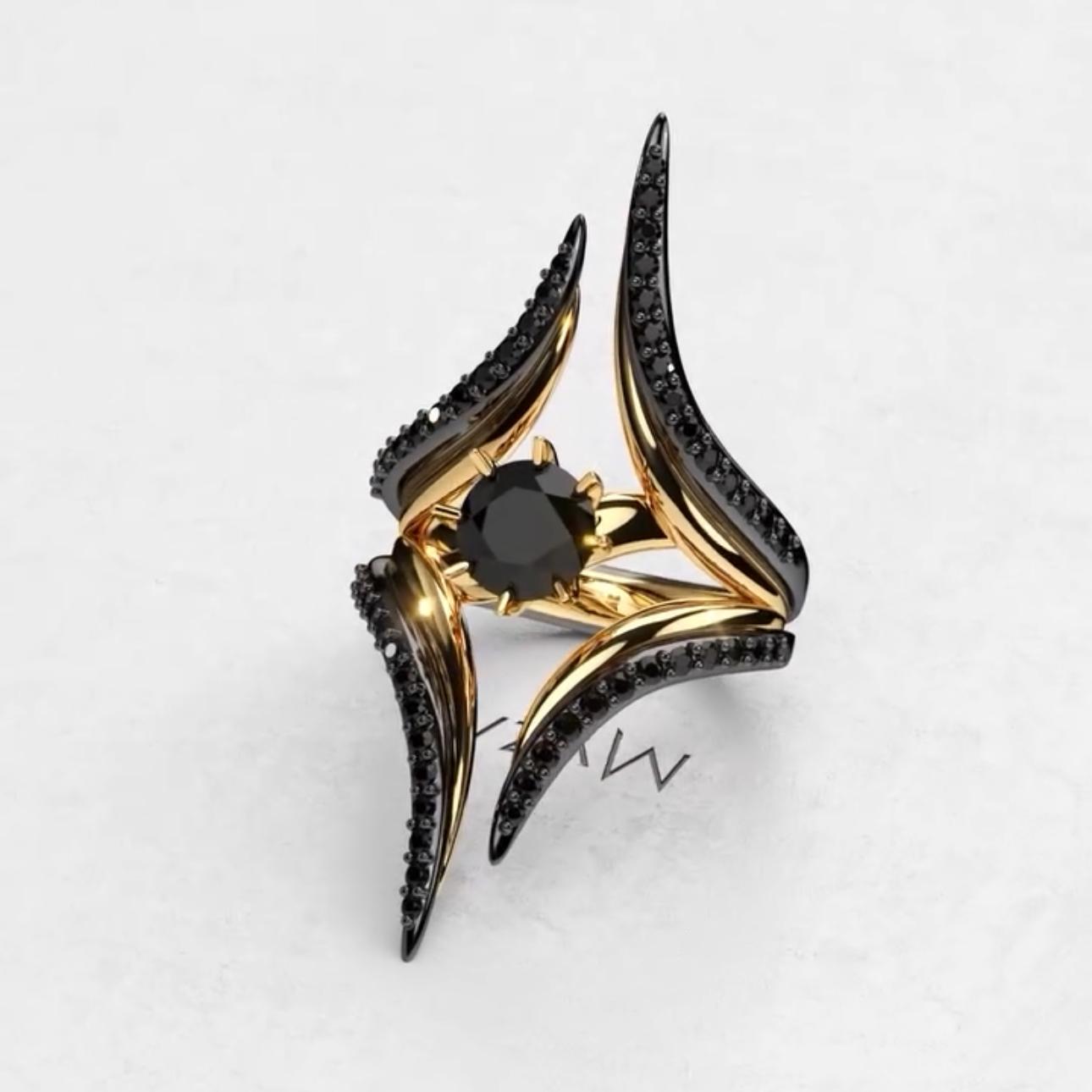 Karanlıkla altının çarpıştığı, göz alıcı bir parmak zırhı. MVZA Nocturne Ring, sivri hatları, siyah taşları ve gotik enerjisiyle gücü stil haline getirenlerin tercihi. Bu yüzük sadece bir aksesuar değil, bir karakter beyanı.