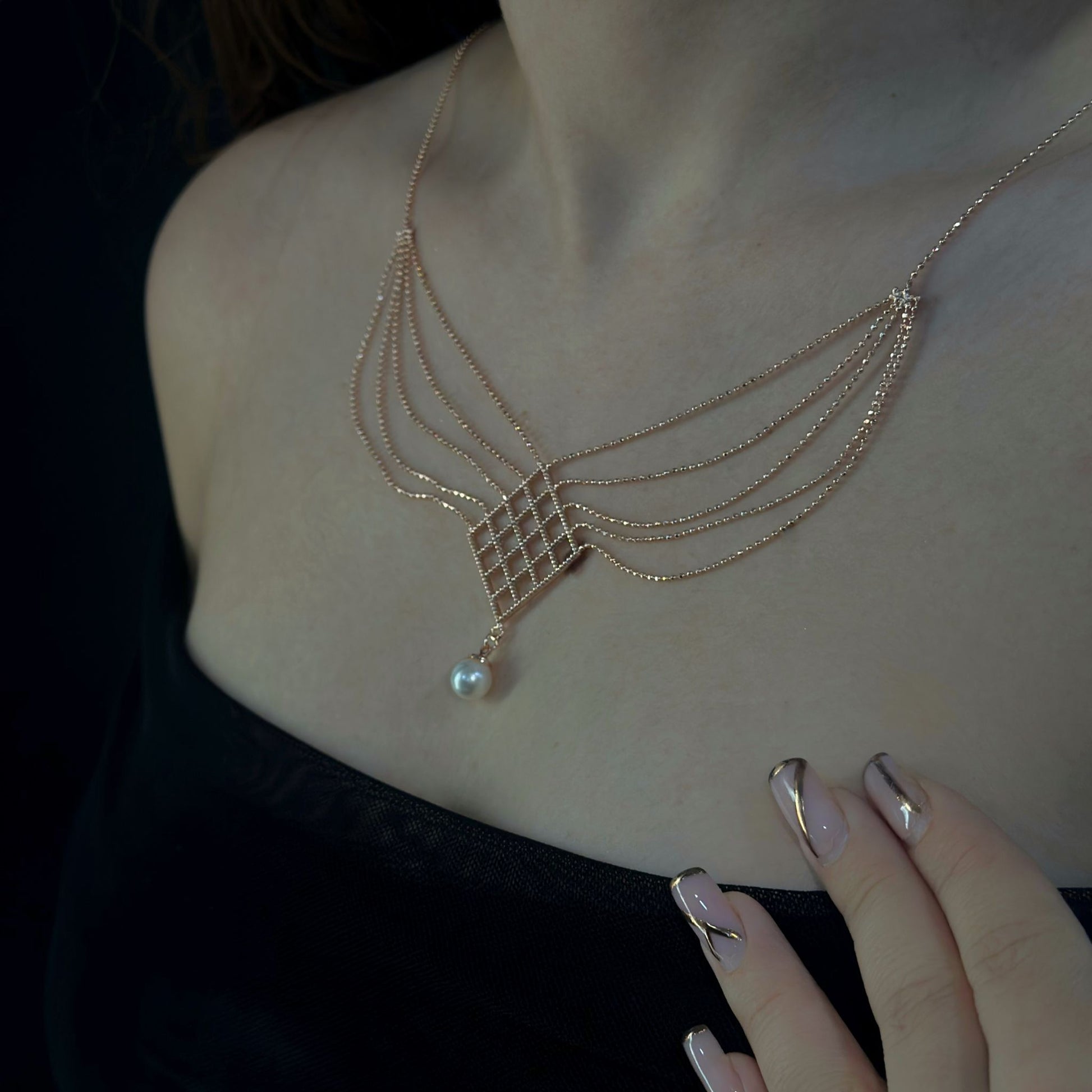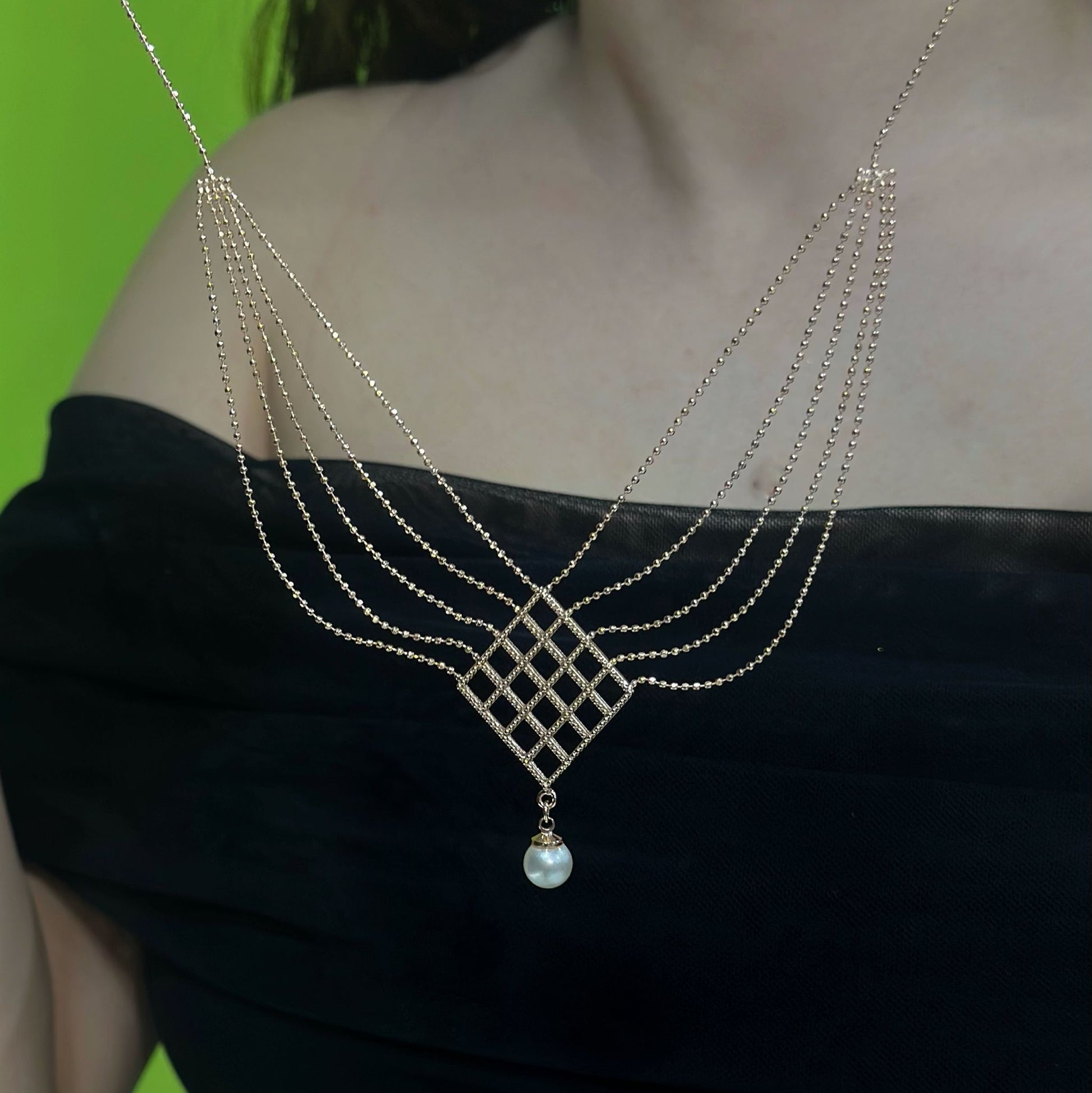 "Zarafeti ve özgün tasarımı bir araya getiren bir kolye mi arıyorsunuz? Pearl Gems kolyemiz, ucunda büyük bir inci tanesi ve ona bağlı uzun, desenli zincirlerle hem şıklığı hem de sade bir zarafeti simgeliyor. Bu özel tasarım, her kombininize sofistike bir dokunuş katmak için tasarlandı.