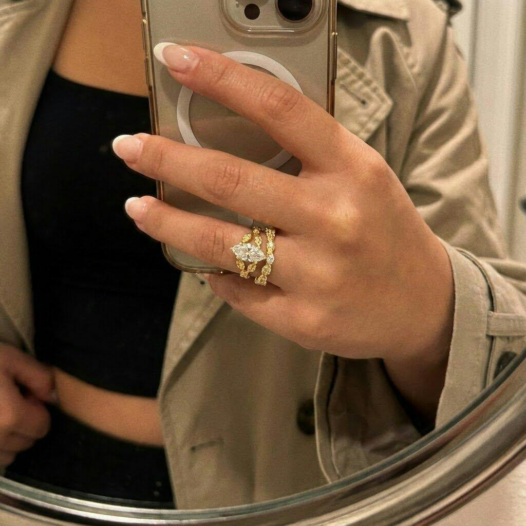 - İnce yaprak motifleriyle doğanın zarif dokunuşunu hissettirirken, ışıltılı taşlarla süslenmiş tamamlayıcı bant yüzüğü ile kombin özgürlüğü sağlar.