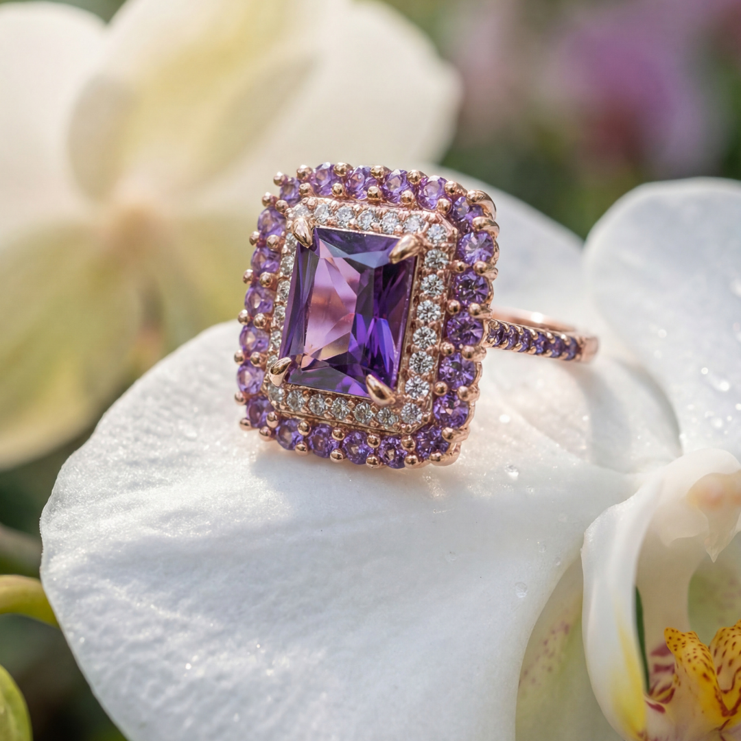 Asil ve Büyüleyici: Morun asaletiyle göz kamaştıran Imperial Amethyst, merkezdeki görkemli taşı ve onu çevreleyen lavanta tonlarındaki ışıltılarla imparatoriçelere yaraşır bir zarafet sunar.