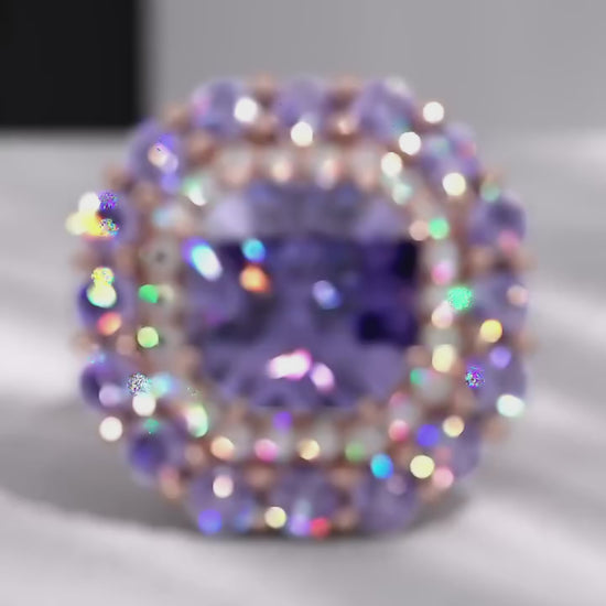 Imperial Amethyst, morun asaletiyle göz kamaştırırken, merkezdeki büyüleyici taş ve çevresini saran lavanta tonlarındaki taşlarla imparatoriçelere yaraşır bir ışıltı sunuyor. Her bakışı üzerine çeken bu tasarım, gücün ve zarafetin birleştiği noktada hayat buldu.