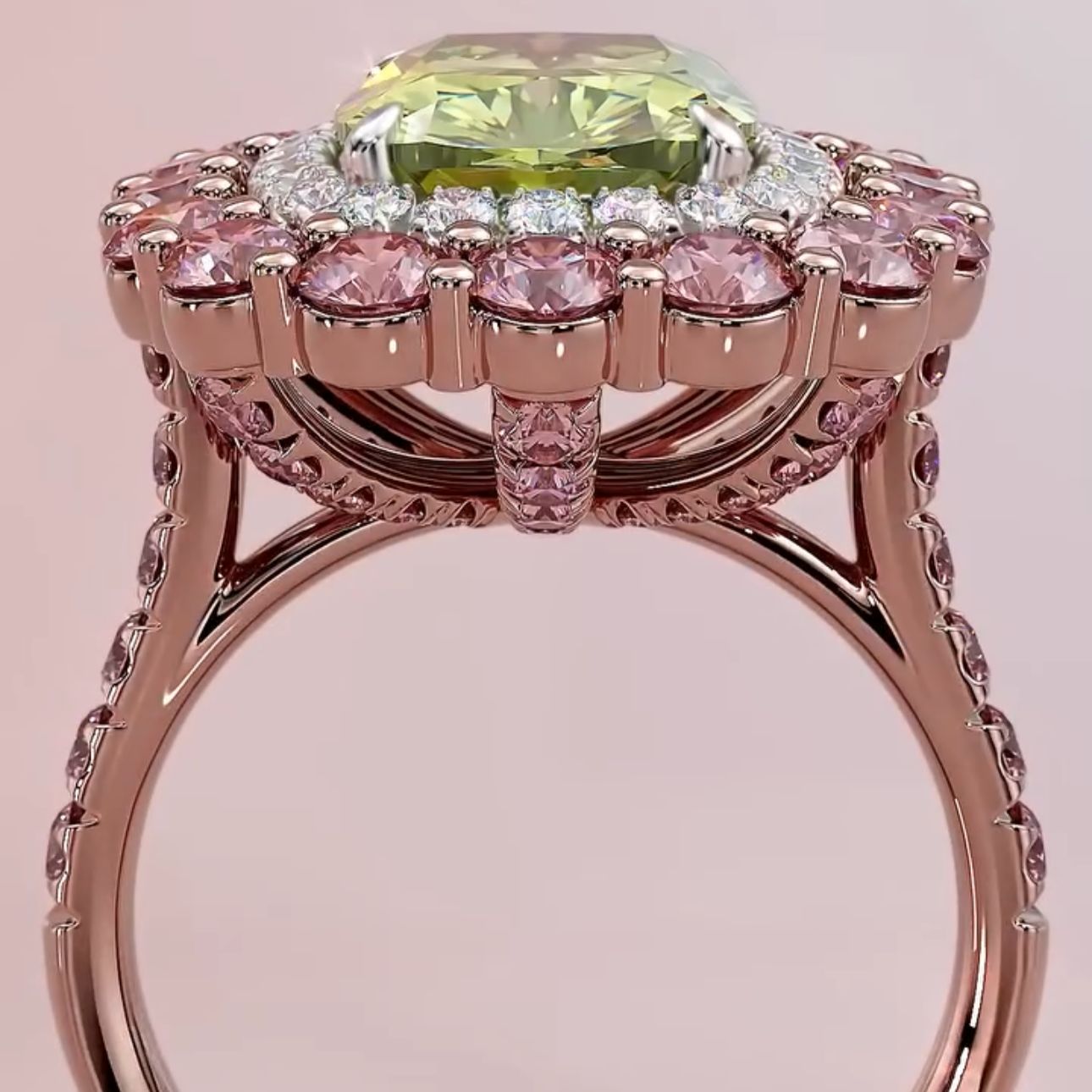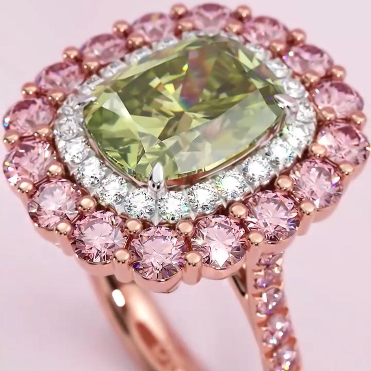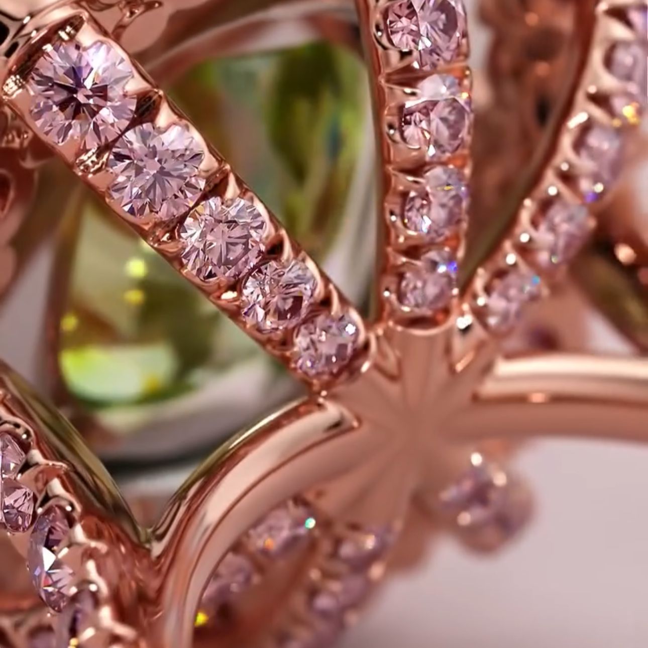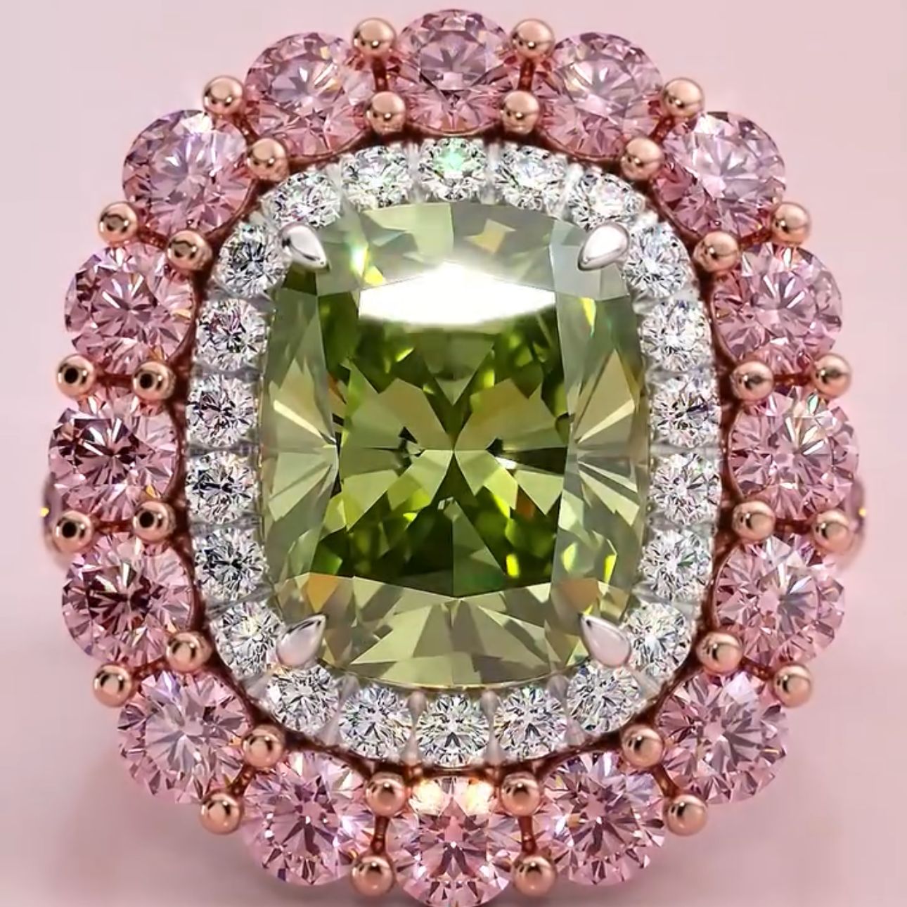 Imperial Blossom, kraliyet zarafeti ve doğanın büyüsünü bir araya getirerek kusursuz bir tasarım sunuyor. Yeşil taşın hipnotize eden ışıltısı, pembe mücevherlerin zarif dokunuşuyla çevrelenerek adeta bir imparatoriçe tacı gibi tasarlandı.