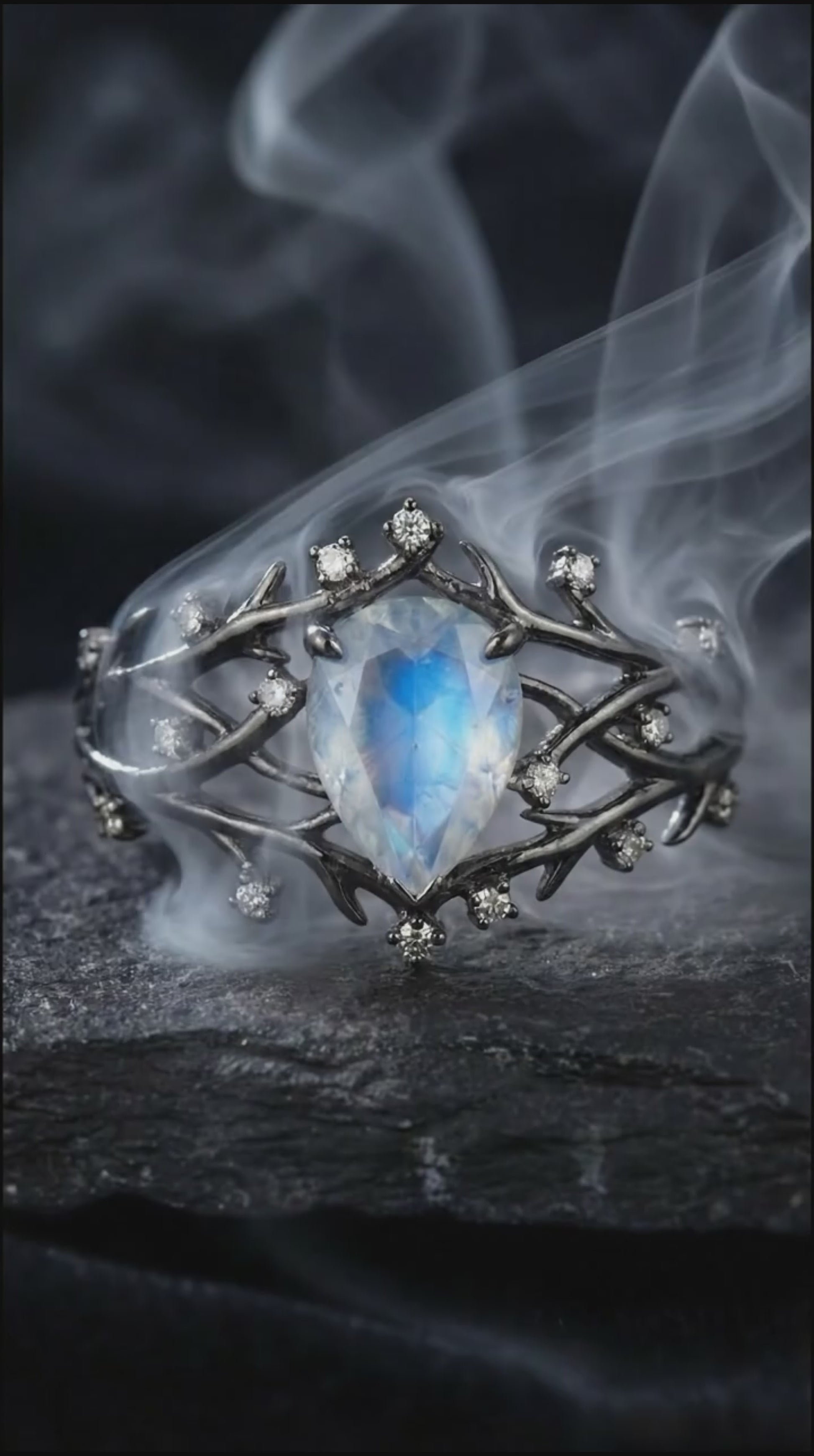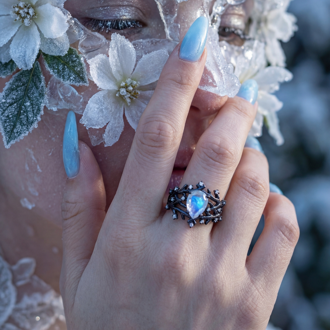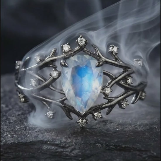 - Büyülü Aytaşı (Moonstone): Yüzüğün kalbinde yer alan damla kesim taş, ışığın açısına göre buz mavisi ve beyaz hareler saçarak renk değiştirir. Tıpkı karanlık bir ormana vuran dolunay ışığı gibi hipnotize edici bir etki yaratır.