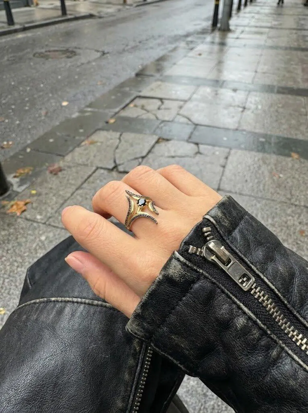 - Karanlıkla altının çarpıştığı MVZA Nocturne Ring, sivri hatları ve siyah taşlarıyla adeta göz alıcı bir parmak zırhını andırır.