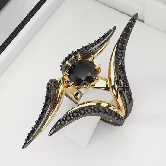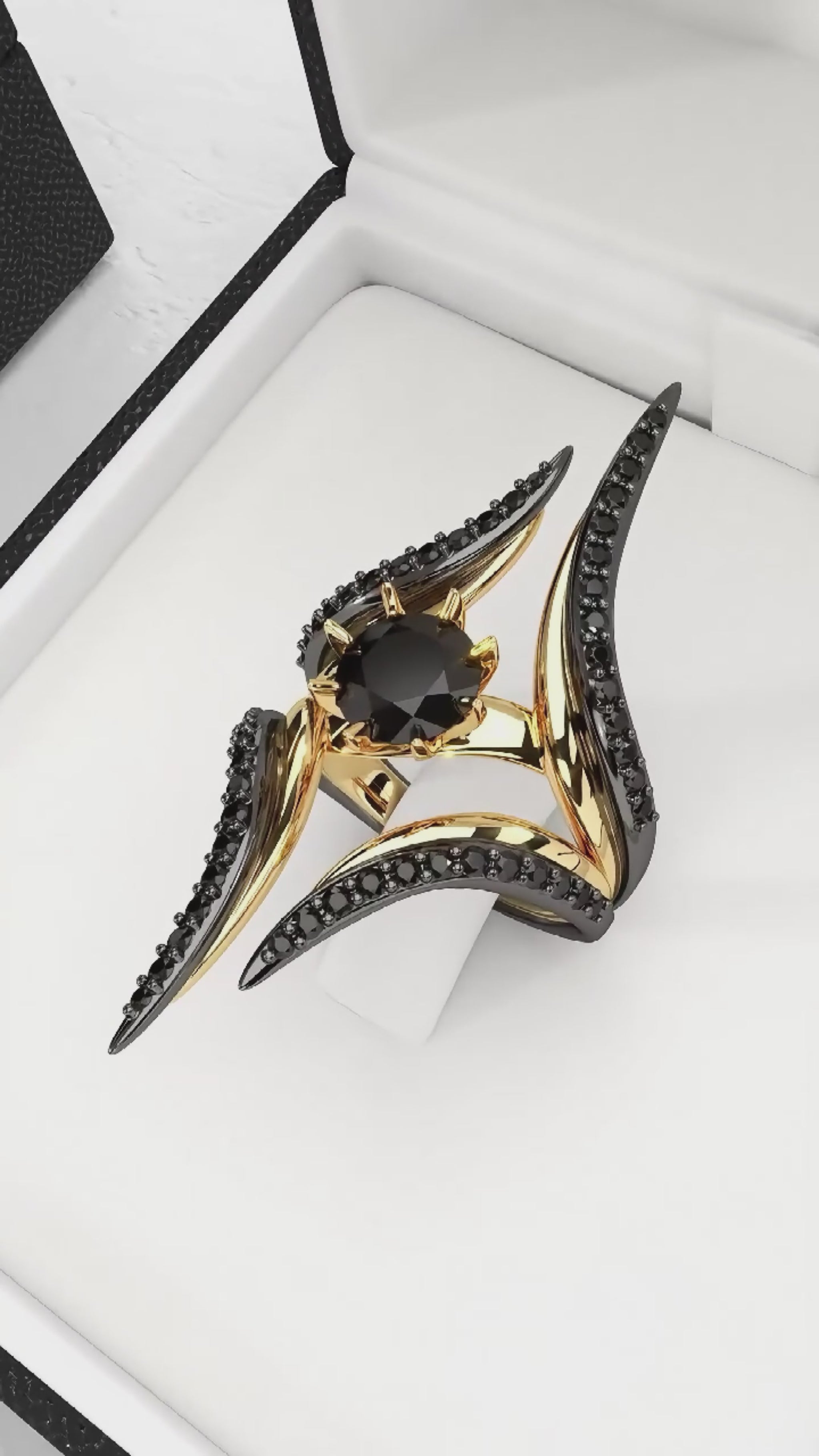 Karanlıkla altının çarpıştığı, göz alıcı bir parmak zırhı. MVZA Nocturne Ring, sivri hatları, siyah taşları ve gotik enerjisiyle gücü stil haline getirenlerin tercihi. Bu yüzük sadece bir aksesuar değil, bir karakter beyanı.