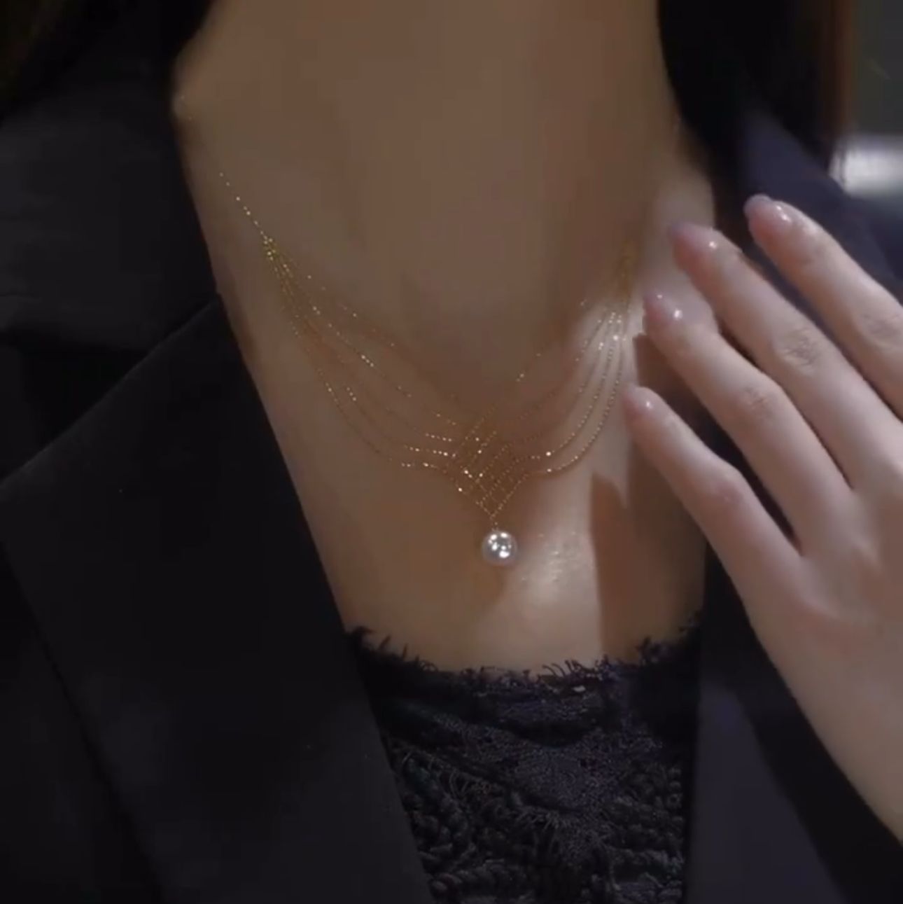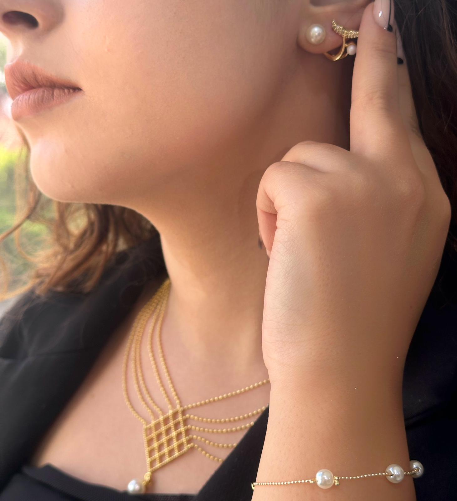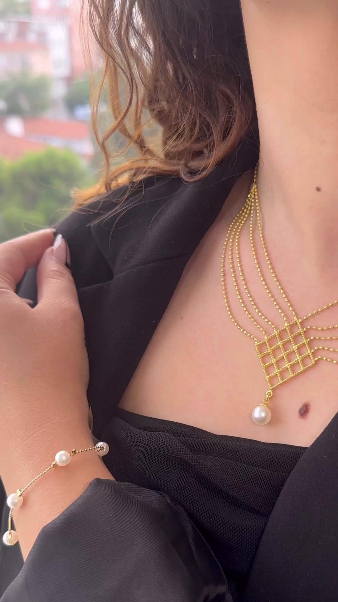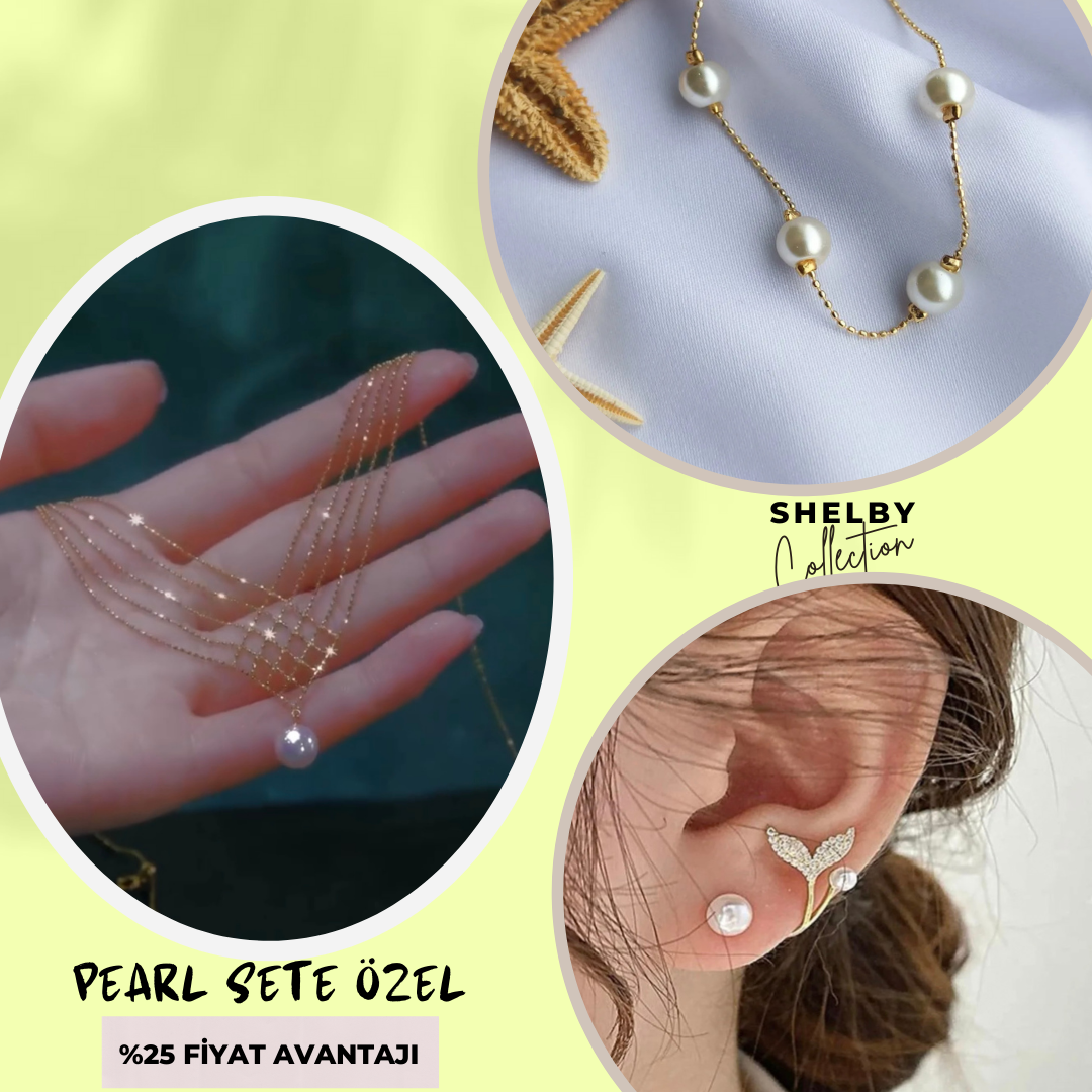 "Zarafeti ve özgün tasarımı bir araya getiren bir kolye mi arıyorsunuz? Pearl Gems Setimiz, ucunda büyük bir inci tanesi ve ona bağlı uzun, desenli zincirlerle hem şıklığı hem de sade bir zarafeti simgeliyor. Bu özel tasarım, her kombininize sofistike bir dokunuş katmak için tasarlandı.