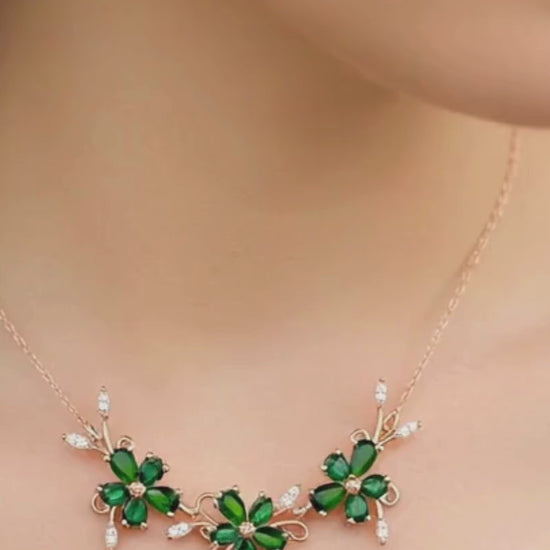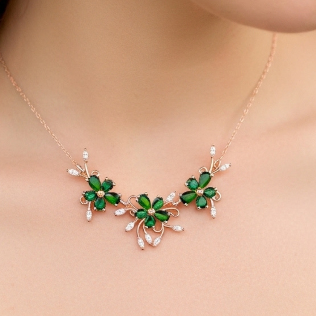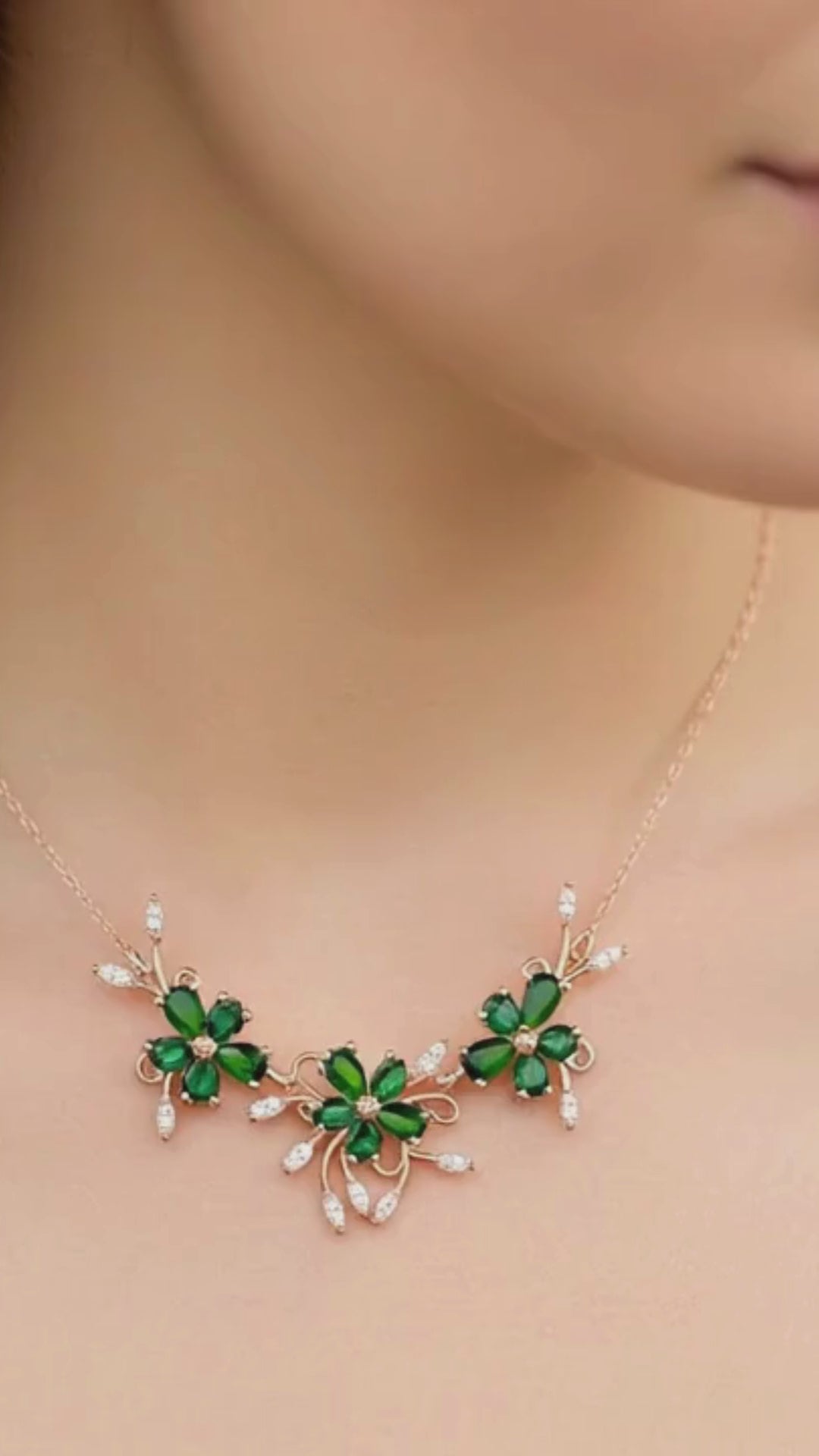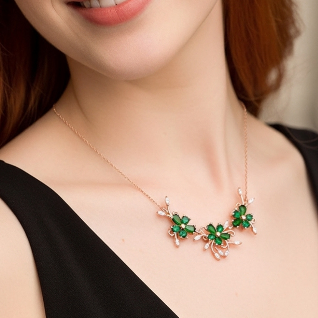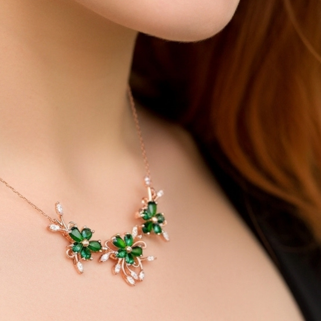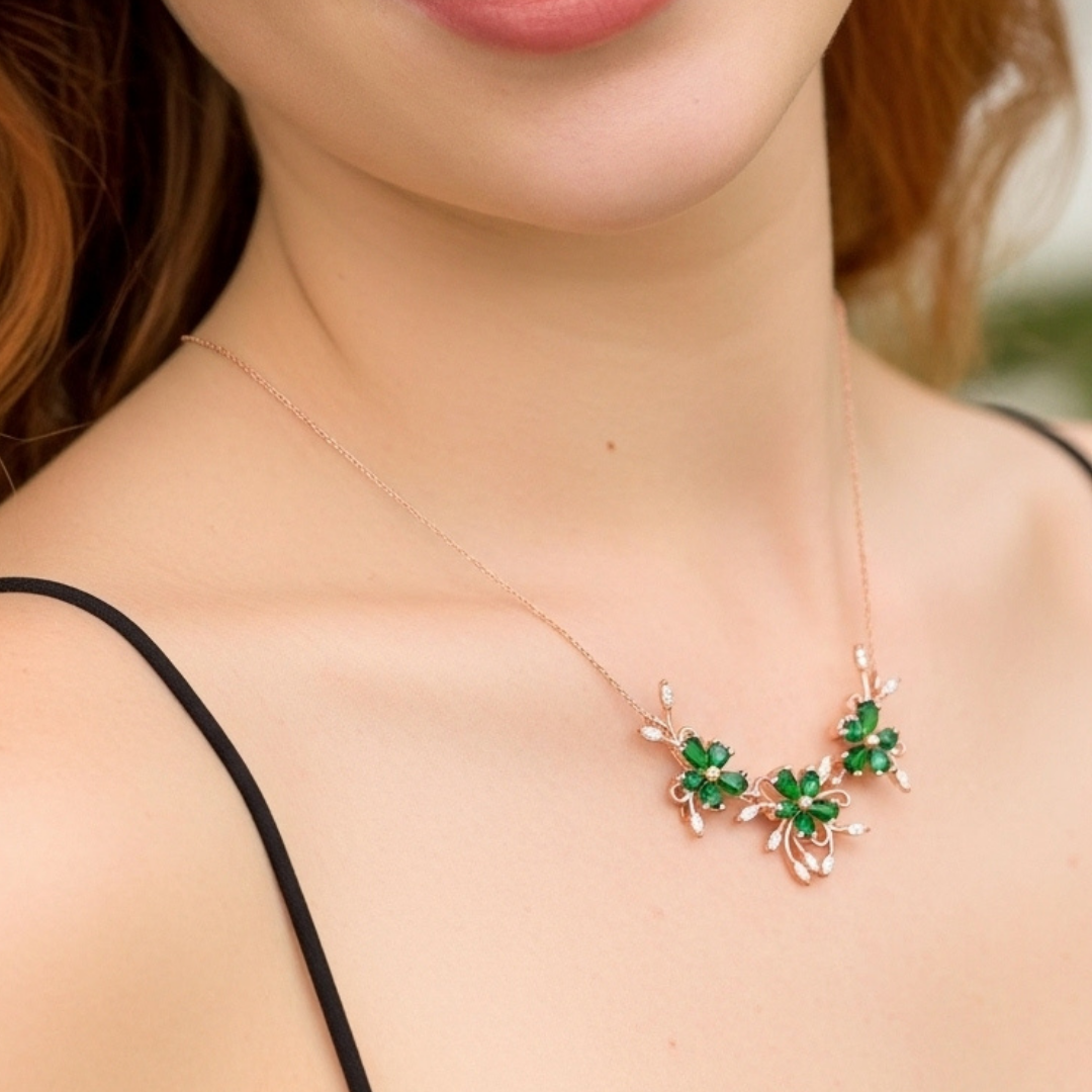 Işıltılı pink sapphire ve emerald zirkon taşları, tasarıma büyüleyici bir renk dengesi kazandırır.